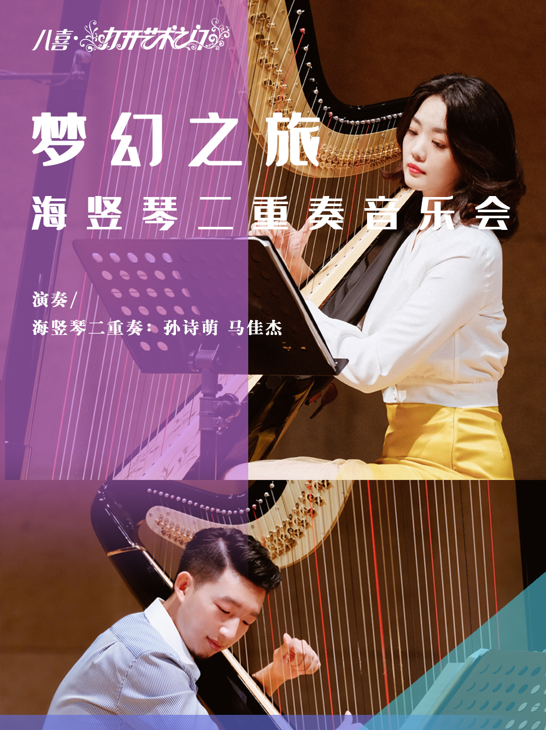 演出:海竖琴二重奏:孙诗萌 马佳杰曲目:李斯特:爱之梦 米哈伊•米切德罗夫:帕格尼尼主题变奏曲 德彪西:阿拉伯风格第1首 古曲 马佳杰改编:春江花月夜斯美塔那:沃尔塔瓦河 柴科夫斯基:圆舞曲 穆索尔斯基:图画展览会