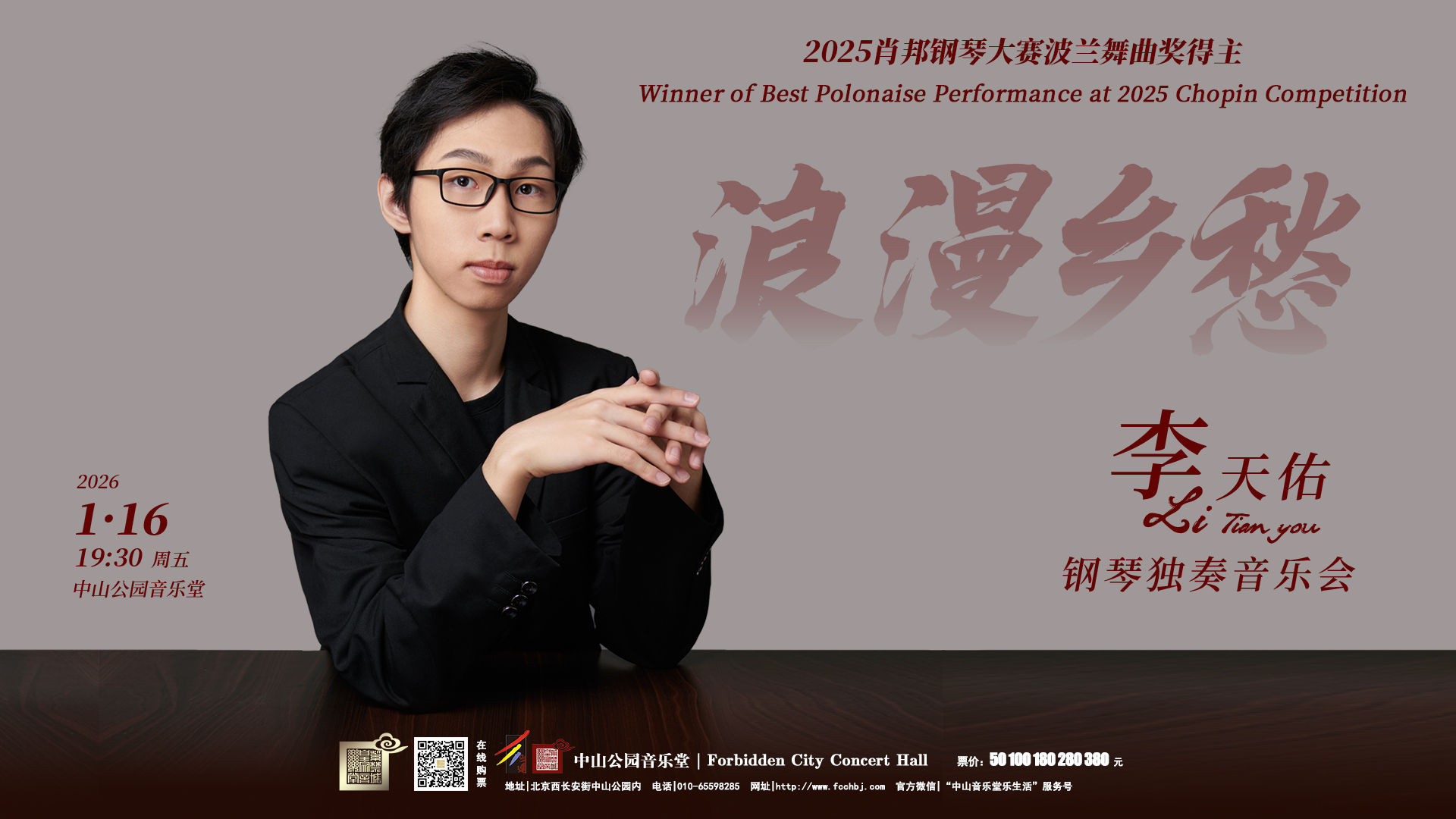 浪漫乡愁—李天佑钢琴独奏音乐会 时间:2025.01.16 场馆:北京市 | 中山音乐堂 票价:50/100/180/280/380 微信订票:18515362586 电话订票:010-66552100,010-66552258